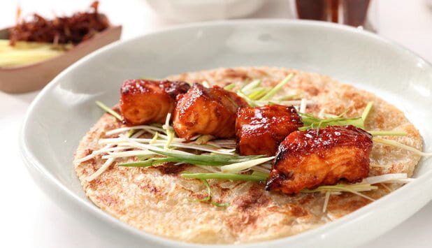 燒烤汁燒挪威三文魚,配雞蛋薄餅